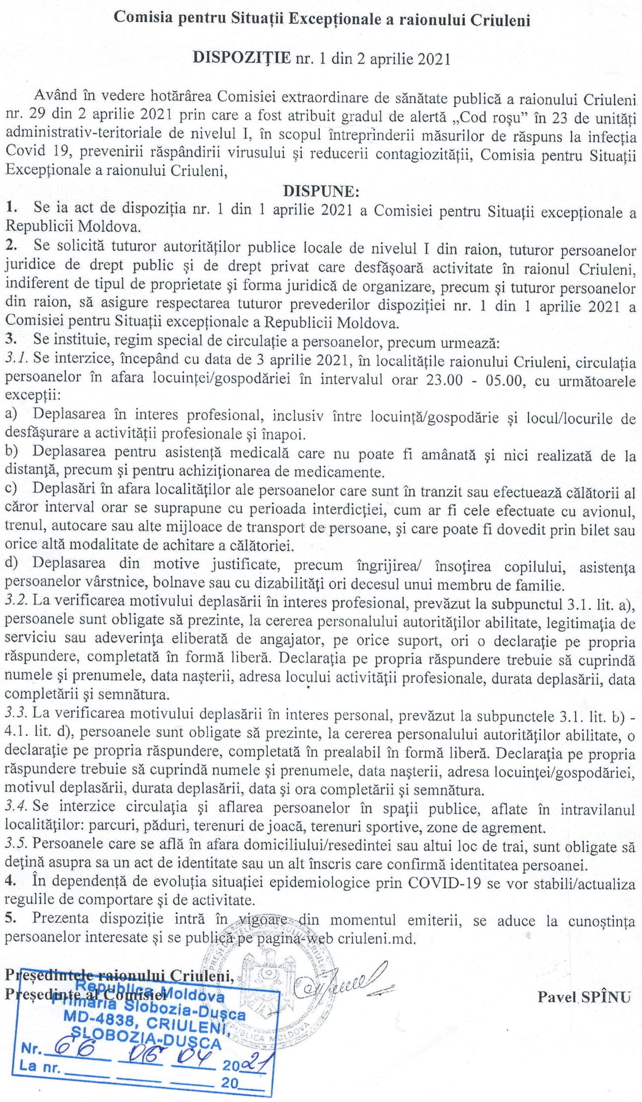 Dispoziția Comisiei pentru Situații Excepționale nr.1 din 02.04.2021